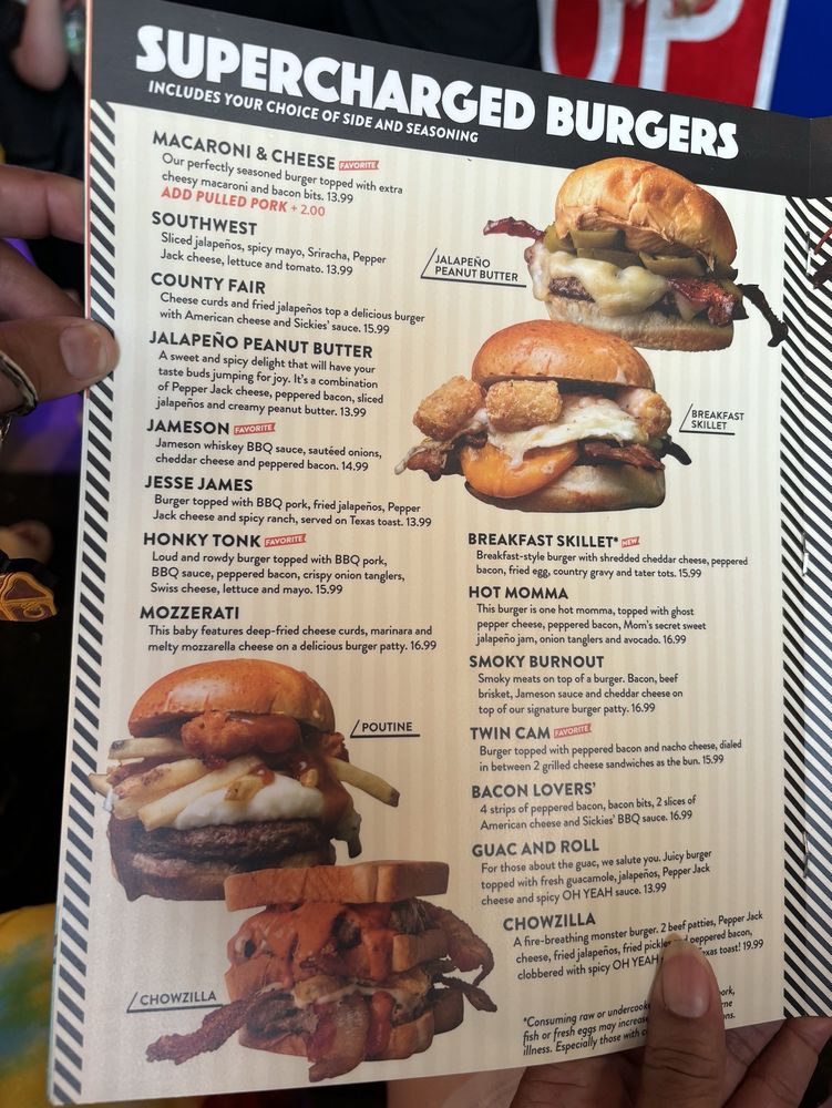 Cheese curds and fried jalapeos top a delicious burger with American cheese and Sickies' sauce.